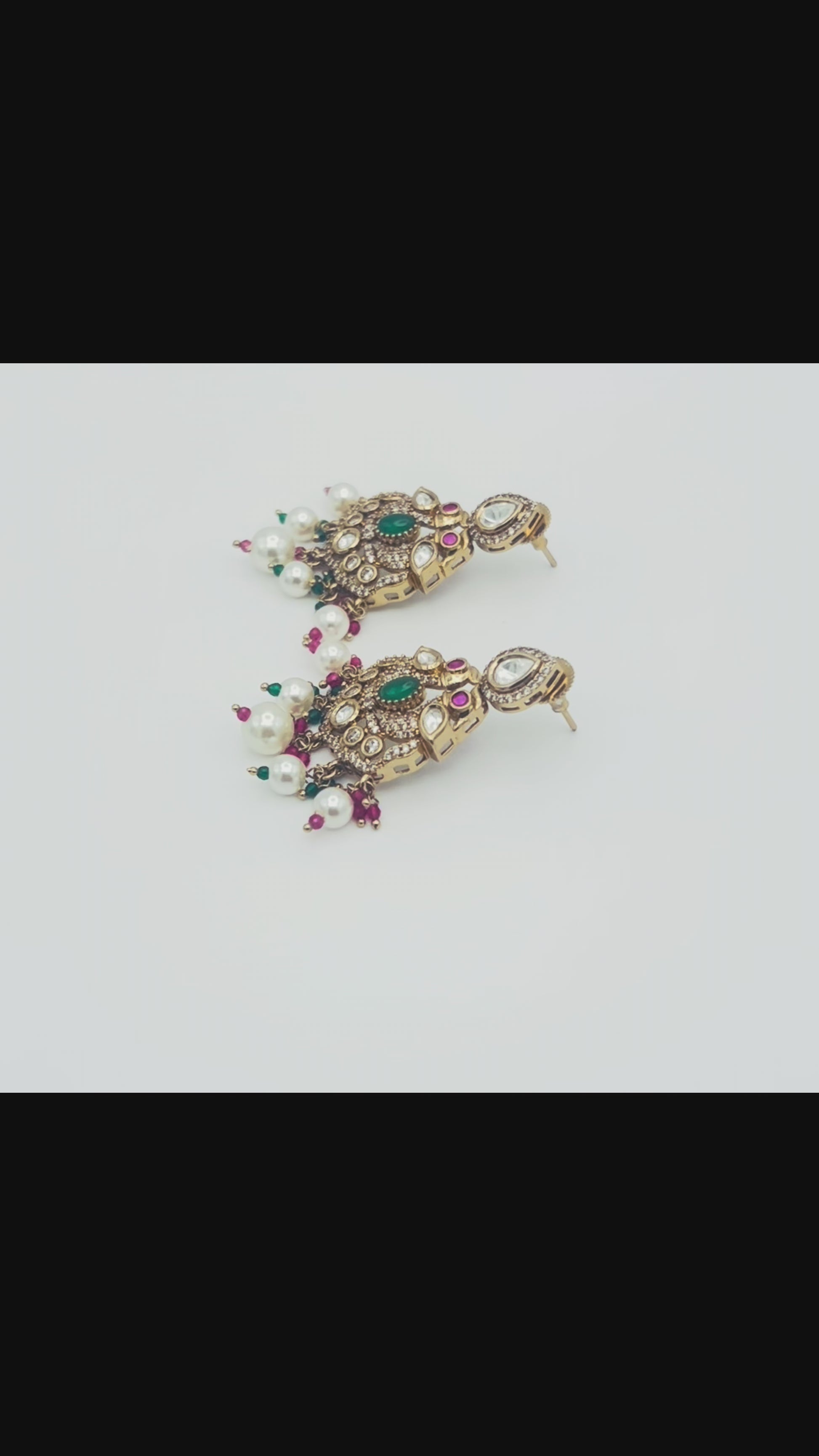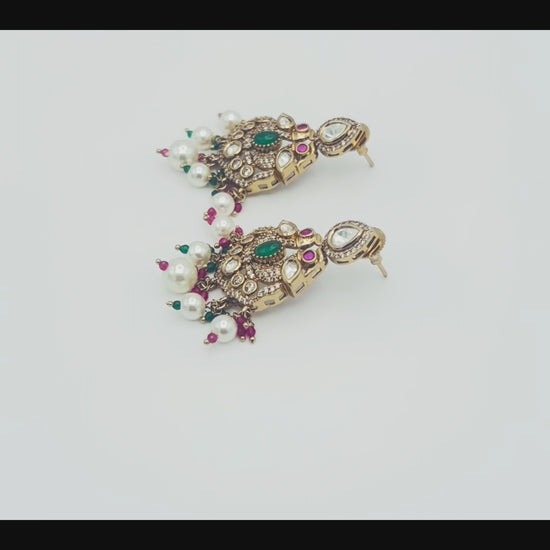 Elegant temple-inspired chandbali earrings available in two distinct styles, each featuring intricate antique polish detailing with kundan-style settings and lustrous pearl drop accents.