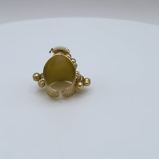This stunning statement ring features an antique gold-tone finish with intricate temple-inspired design, adorned with pearl-style accents and delicate floral detailing, creating an elegant accessory for special occasions.