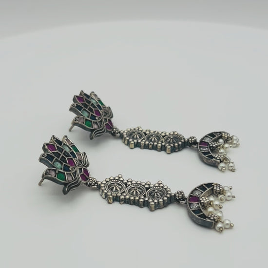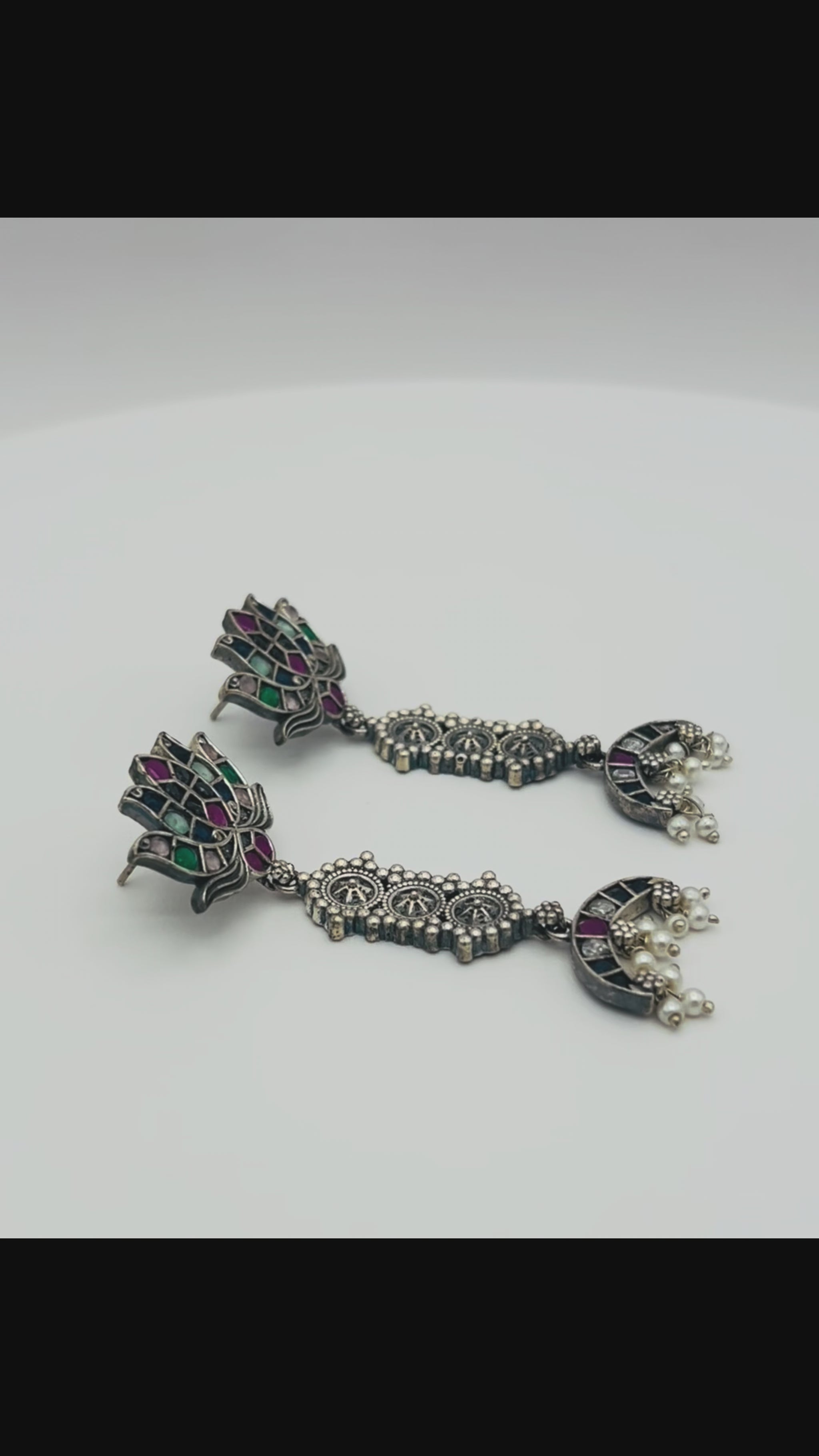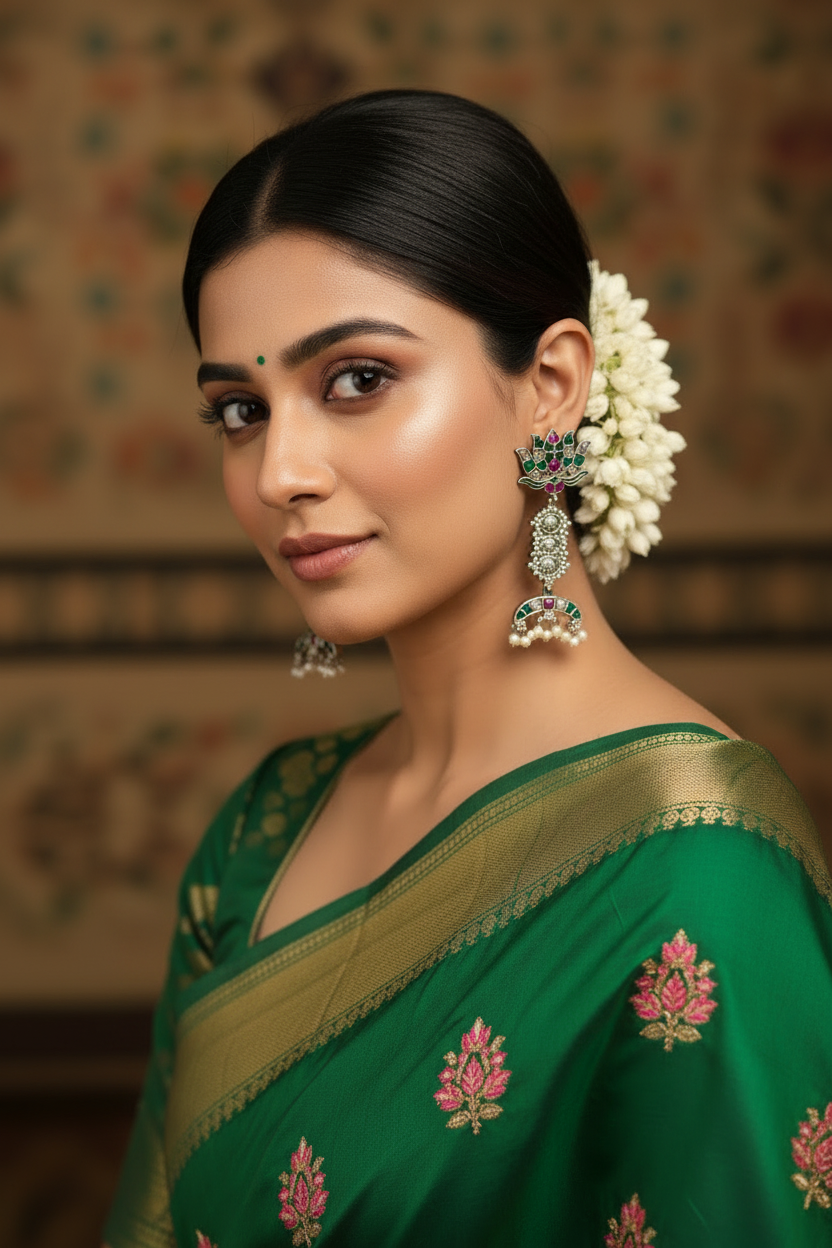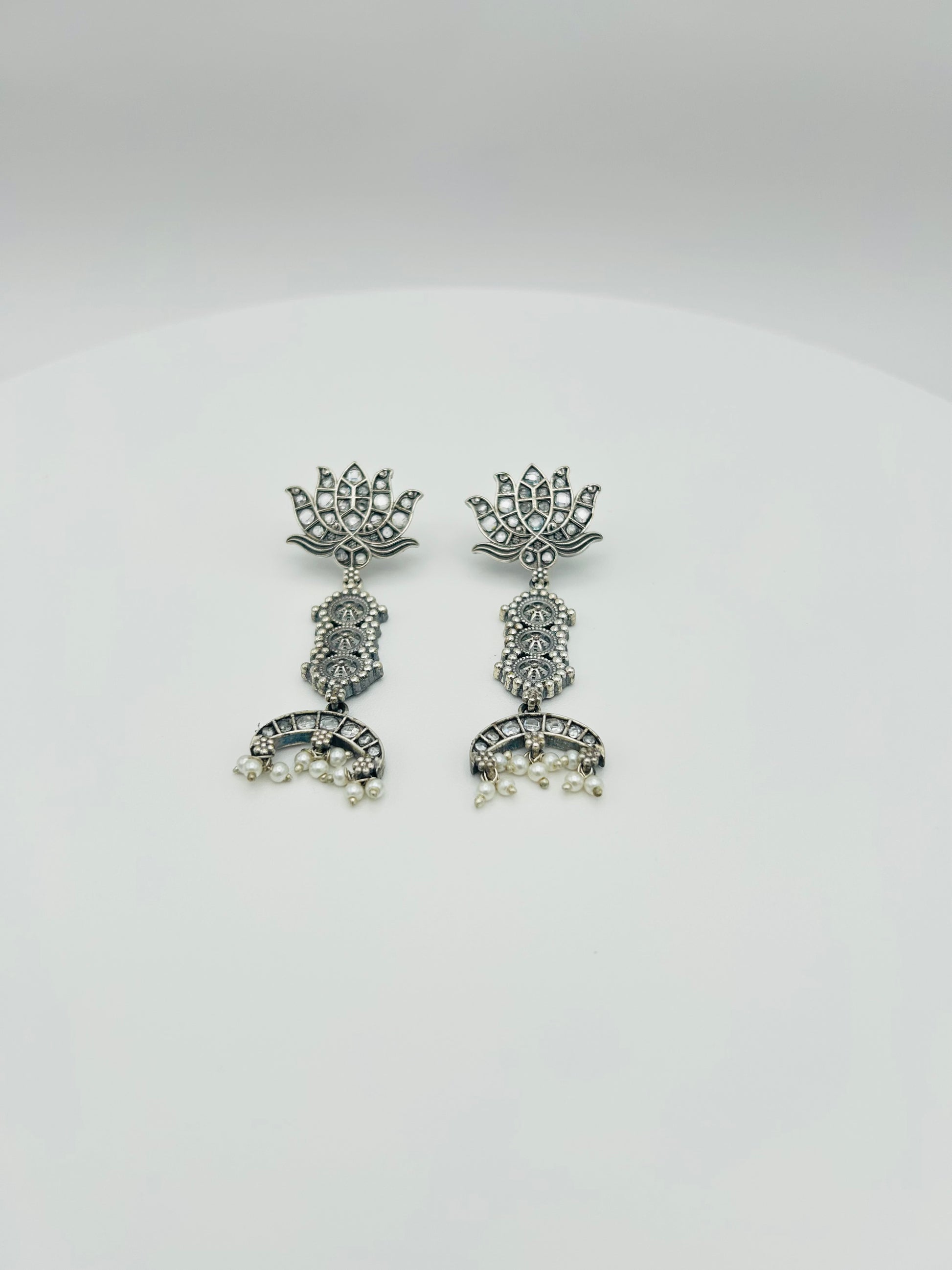 These elegant chandbali-style earrings feature intricate lotus motif detailing with pearl drops, inspired by traditional temple jewelry, creating a graceful accessory for weddings and festivals.