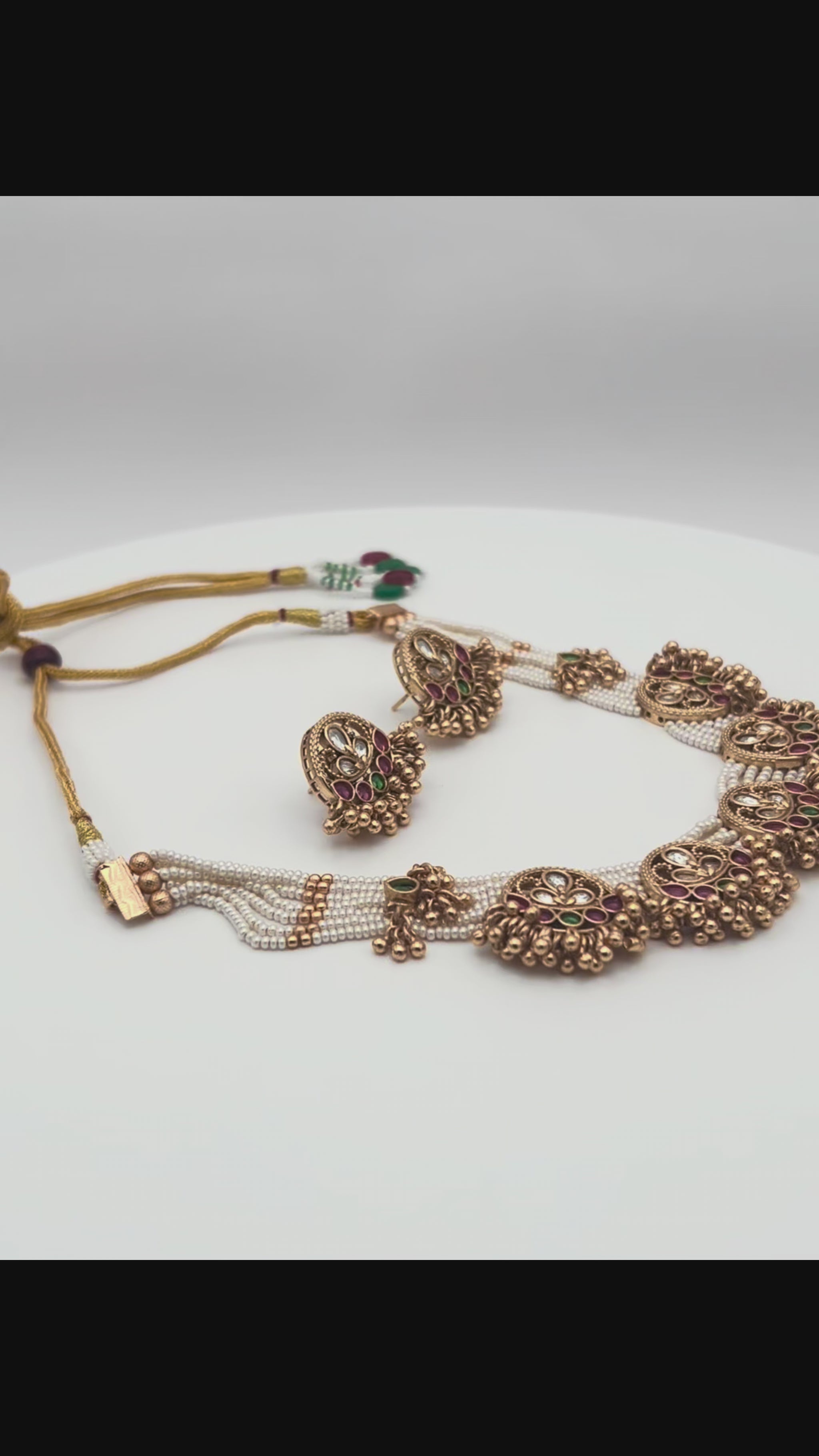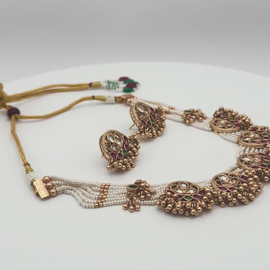 This exquisite multi-strand pearl necklace set features intricate temple-inspired floral medallions with peacock and lotus motifs, paired with matching statement earrings, creating a stunning bridal accessory for weddings and special occasions.