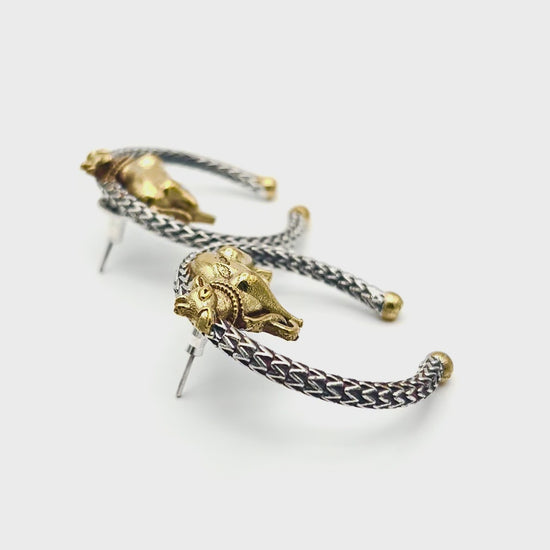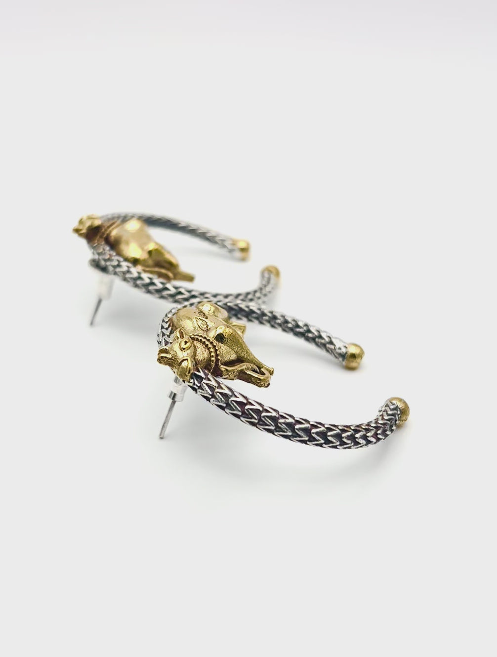 Embrace traditional elegance with these stunning Dual-Tone Gau Mata C-Hoop Earrings. These artisanal half-hoop earrings showcase the revered Indian Cow (Gau Mata), a deeply sacred symbol of purity, nourishment, abundance, and divine protection in Hindu culture. The intricately crafted cow head is rendered in a beautiful brass or gold-tone finish, creating a dazzling focal point. The cow sits atop a rustic C-hoop featuring a unique, braided texture finished in a dark, antique oxidized silver. This mixed-metal design provides a striking contrast and a traditional, tribal aesthetic. Perfect for festive occasions like Diwali or Navratri, cultural gatherings, or as a meaningful statement piece for everyday wear. These handcrafted earrings are a wonderful tribute to Indian heritage and artistry. Closure: Post/Stud with backing. • Approximate Dimensions: Crucial: 1.8”x1.8” Measure the drop length and width