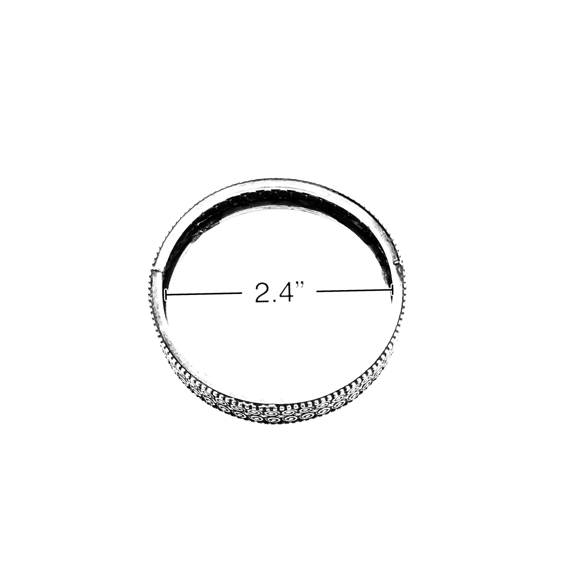 Dark Silver Bangles (Set of 2) Transport your look with these magnificent bangles, blending timeless ethnic design with a sophisticated vintage aesthetic. Sold as a pair, rich oxidized finish, making them an indispensable addition to your traditional and contemporary wardrobe. ✨ Key Features • Design: Each bangle is meticulously crafted with a continuous, simple repeating circular, creating a detailed and rich texture. • Finish: Treated with a deep oxidized silver finish, giving the metal an antique, vintage, and highly desirable dark patina. • Quality: These are solid, rigid bangles that feel substantial on the wrist, offering a luxurious light weight. • Versatility: Perfect for mixing and matching with other bangles to create a vibrant stack, or worn simply as a stunning pair for a defined look. Perfect For • Festive Occasions: Diwali, Eid, Navratri, or any family celebration. • Ethnic Wear: Complementing Sarees, Lehengas, Kurtis, and Salwar Suits. • Gifting: A classic and beautiful gift for birthdays, anniversaries, or wedding favors. Size:"Available in sizes 2.4”, 2.5”.