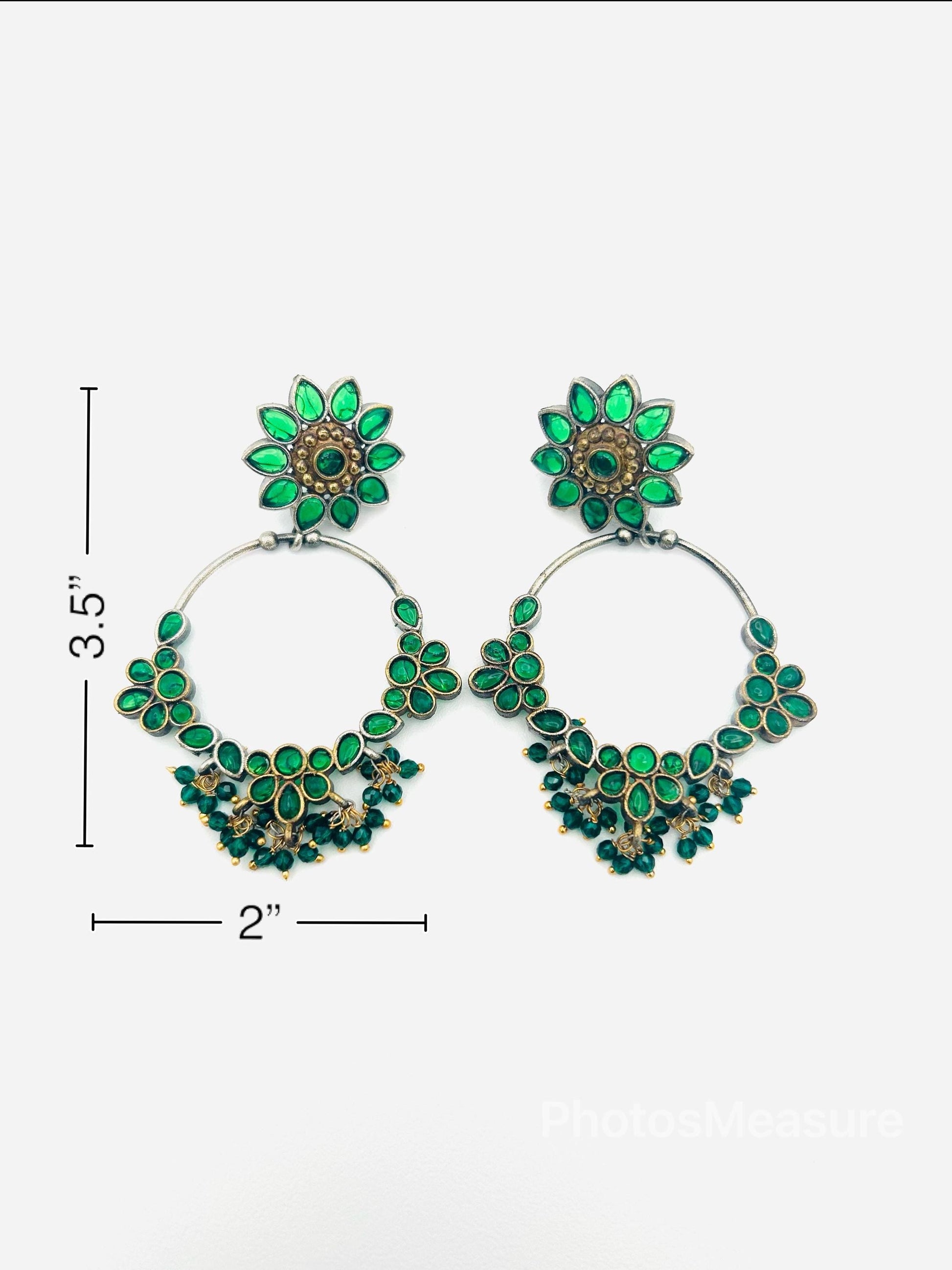 ✨ Handcrafted Oxidized Silver Green Flower Hoop Dangle Earrings ✨ Make a vibrant and graceful statement with these exquisite Oxidized Silver Hoop Dangle Earrings. They feature a beautiful combination of a detailed floral stud and a sweeping hoop adorned with faceted green stones, making them an ideal accessory for festive occasions and celebrations. ✨ Key Features: • Two-Part Design: These earrings combine a fixed stud with a large, swinging hoop for maximum movement and impact. • Floral Stud: The top features a prominent, multi-petaled flower stud with a central green stone. • Hoop Dangle: A large, circular hoop is decorated with clusters of stylized green leaf/flower-shaped stones. • Gemstone Drops: The bottom edge of the hoop features a dramatic fringe of small, faceted green beads and tiny golden accents, creating a traditional Jhumka-style cluster effect. • Oxidized Finish: The metal framework German Silver has a rich, dark oxidized finish which perfectly sets off the vibrant emerald green stones, giving the piece a coveted antique look. • Style: These are substantial, shoulder-dusting earrings that embody the elegance of Traditional Indian Jewelry and are perfect for Sangeet, Mehndi, Diwali, or any event where you want a stunning ethnic focal point. • Style: Statement Hoop, Ethnic, Festive, Boho