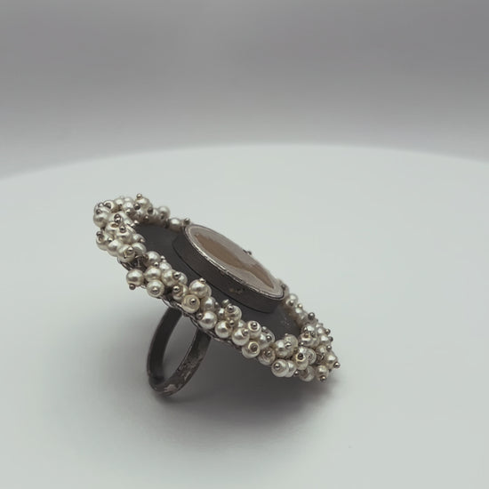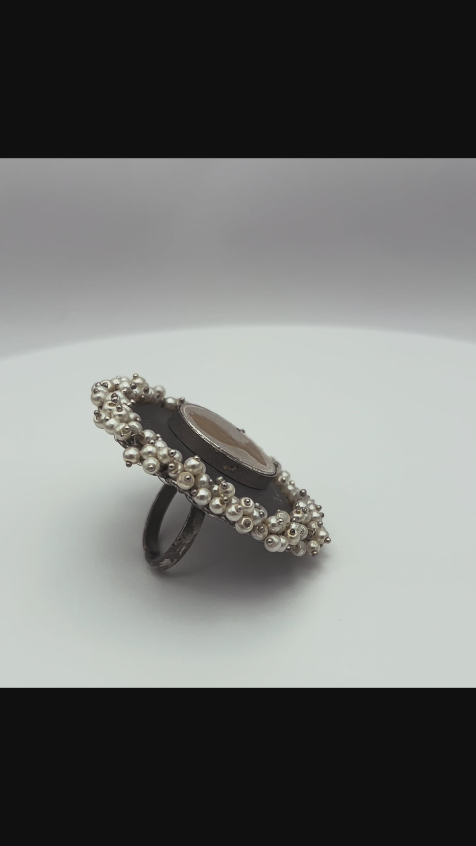 Make a bold statement with this stunning oversized cocktail ring featuring an elegant cameo coin centerpiece encircled by intricate pearl-like beadwork. This eye-catching piece combines vintage charm with modern wearability through its adjustable band design.