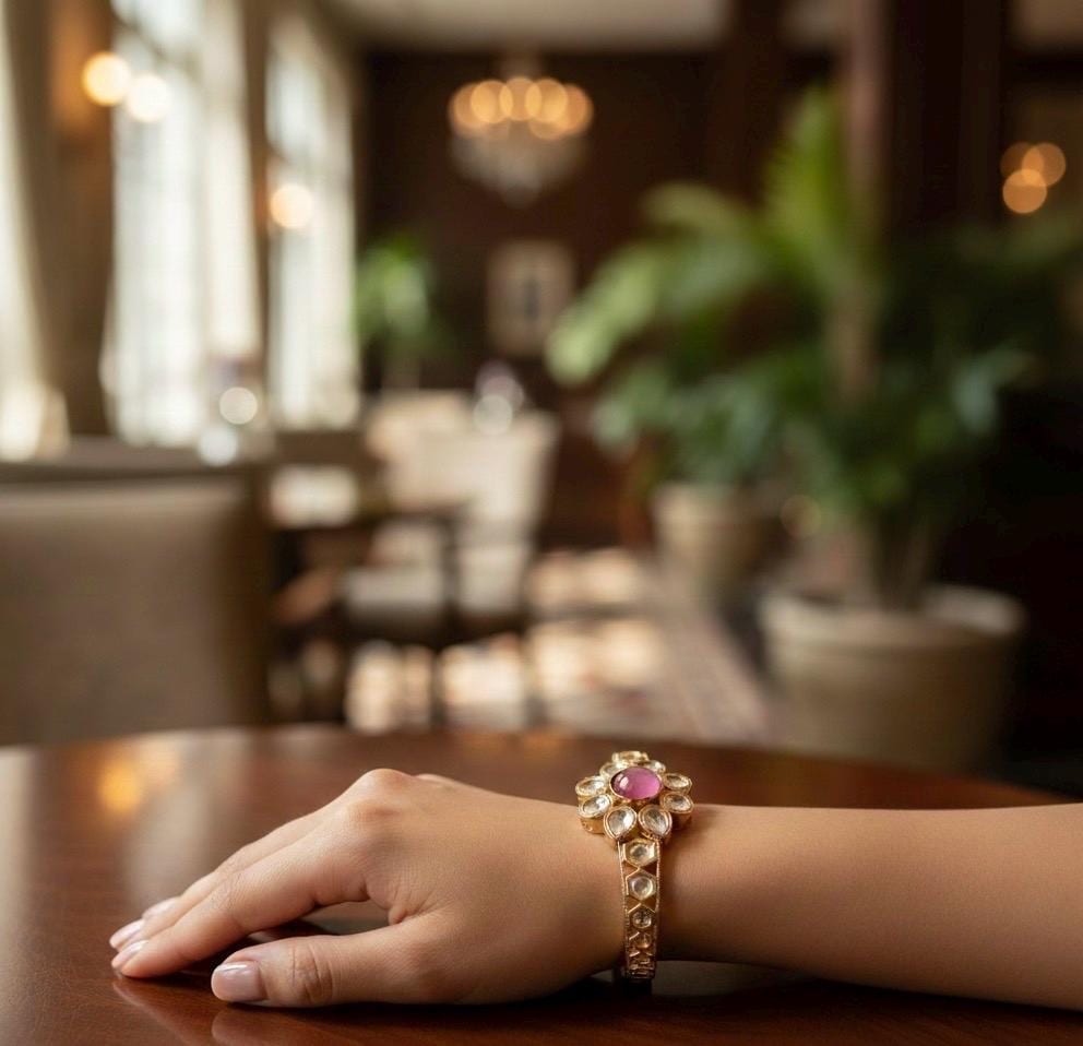 • Ornate Band: Gold-tone band features beautiful decorative shapes with additional Polki-style clear stones set throughout, extending the sparkle around the wrist