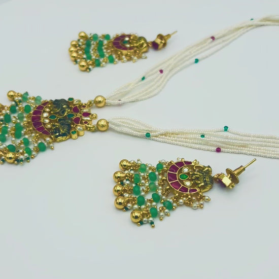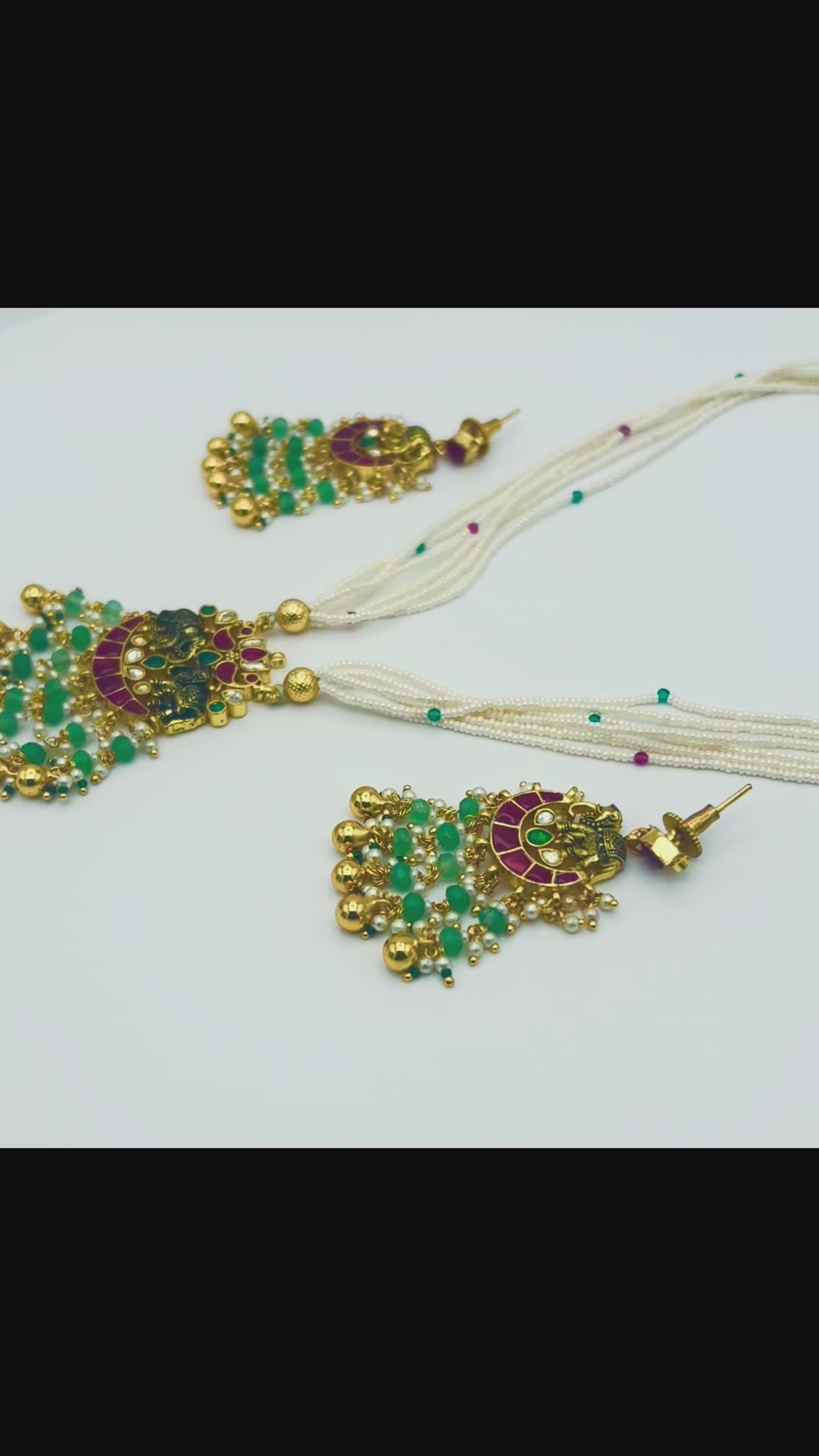 Stunning temple-inspired necklace set featuring a multi-strand pearl design with an ornate elephant motif pendant and matching chandbali earrings. This statement piece showcases antique gold finish with traditional temple detailing, vibrant ruby and emerald stones, and elegant golden bead accents.