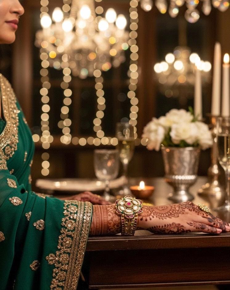 This magnificent cuff bracelet captures the rich artistry of Kundan-style and traditional Indian heritage jewelry. Its substantial size and intricate detailing make it a show-stopping statement piece.