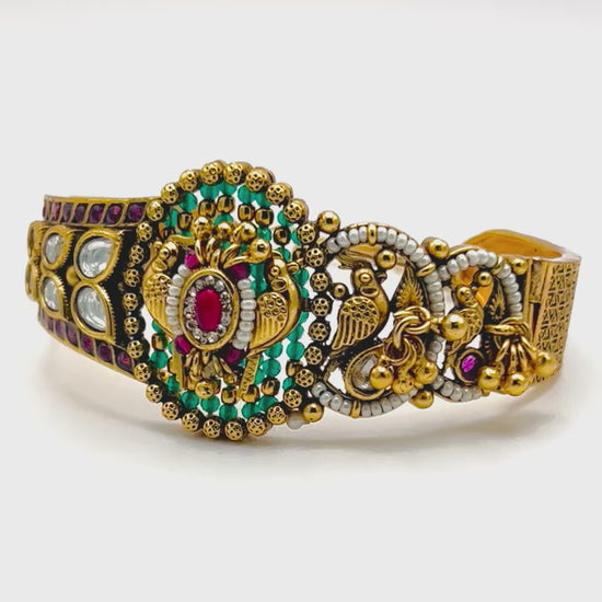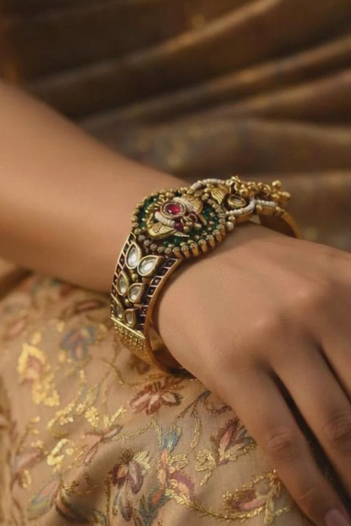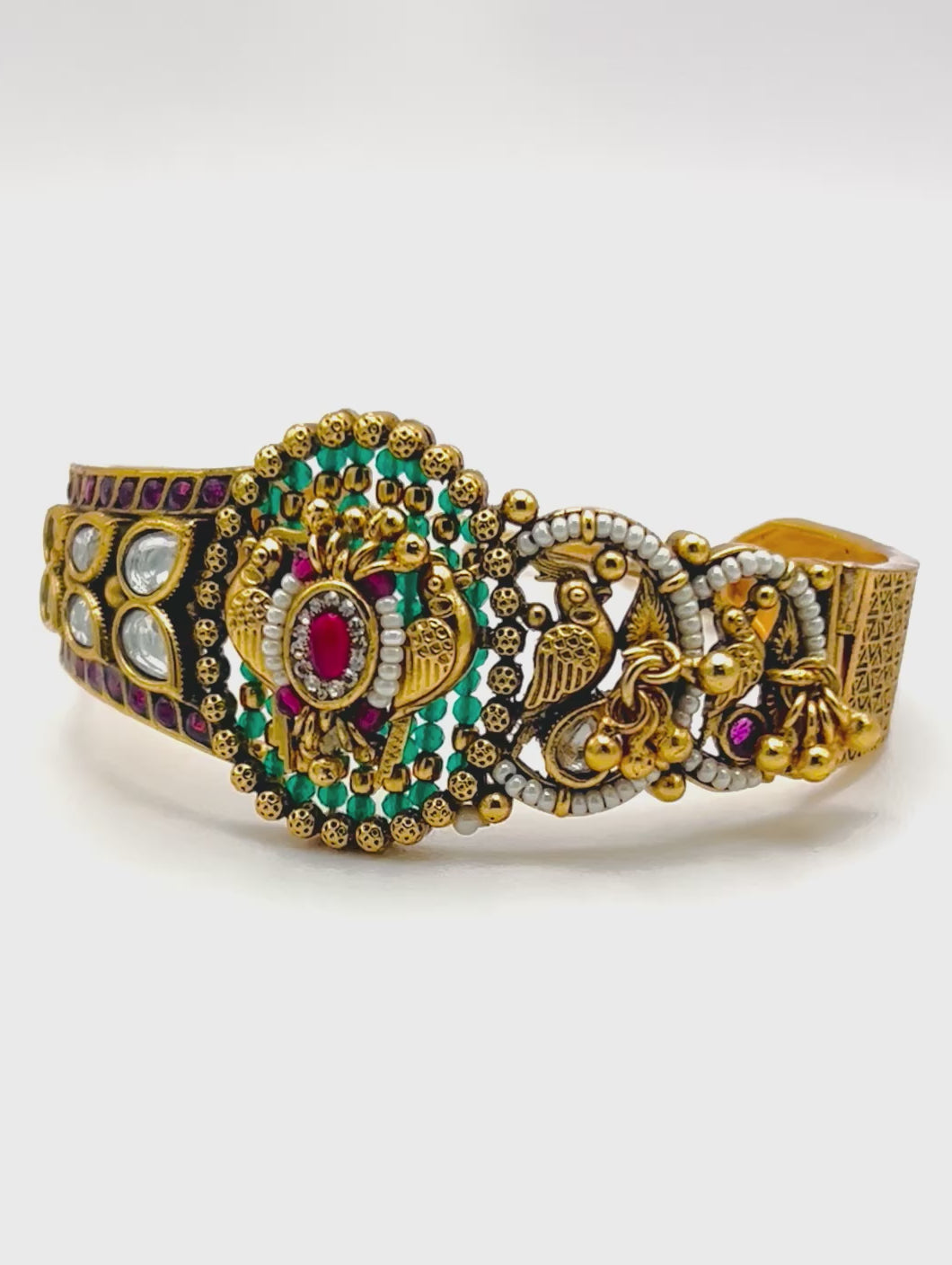 Elevate your traditional ensemble with this exquisite, wide gold-tone cuff bracelet, inspired by classic Indian heritage jewelry. This piece is a true statement accessory, perfect for weddings, festivals, and grand occasions. Key Features: • Design: Features an intricate central motif of two detailed peacocks (Mayura) facing a sparkling, oval-cut ruby-red stone. The peacock is a classic symbol of beauty and grace in Indian culture. • Embellishment: Heavily studded with uncut white stones (Polki/Kundan style) in tear-drop settings on the side panels. The centerpiece is highlighted by vibrant turquoise and small gold-tone beads, along with delicate pearl-white accents. • Style: The rich craftsmanship reflects traditional Kundan and Mughal-era jewelry techniques, giving it a regal, heirloom appeal. • Wearability: Designed as an adjustable cuff open-back for comfortable and easy fitting on most wrist sizes. • Occasion: Ideal for brides, bridesmaids, or anyone attending Sangeet, Mehendi, Wedding Receptions, Diwali, Navaratri or formal ethnic gatherings. size: Adjustable bracelet lenght 5.5" - 7"