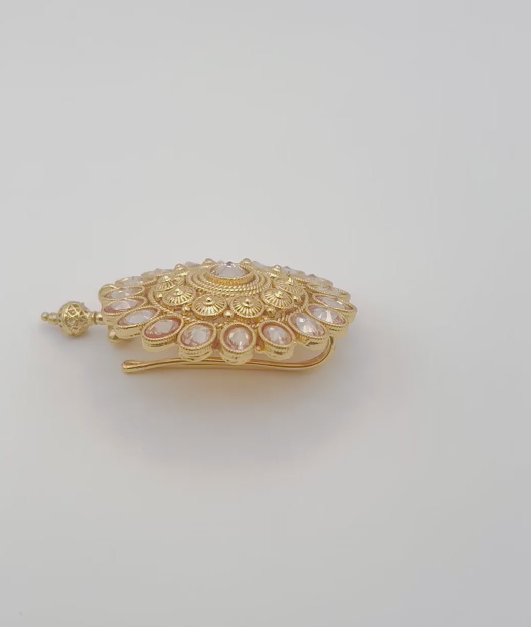 This stunning hair brooch features a radiant sunburst design with intricate kundan-style settings, creating an elegant accessory for weddings and special occasions.
