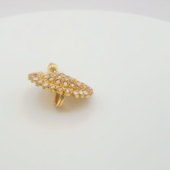 This elegant sunburst-style hair brooch features intricate kundan-style embellishments with pearl and crystal accents, creating a radiant accessory for weddings and festivals.