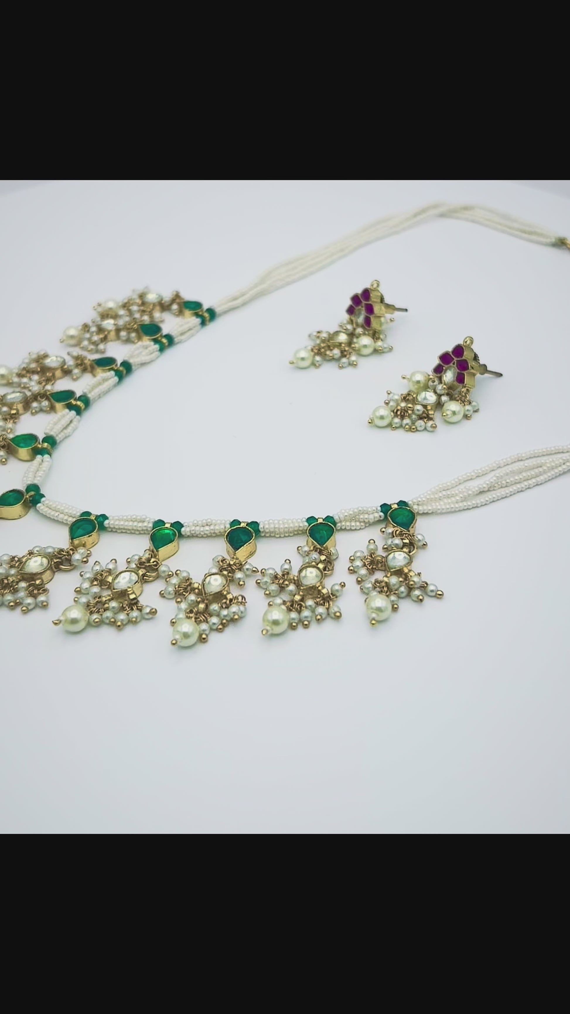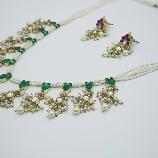 Pearl Temple Necklace Set with Green & Ruby Stones - Traditional Jewelry with Matching Earrings