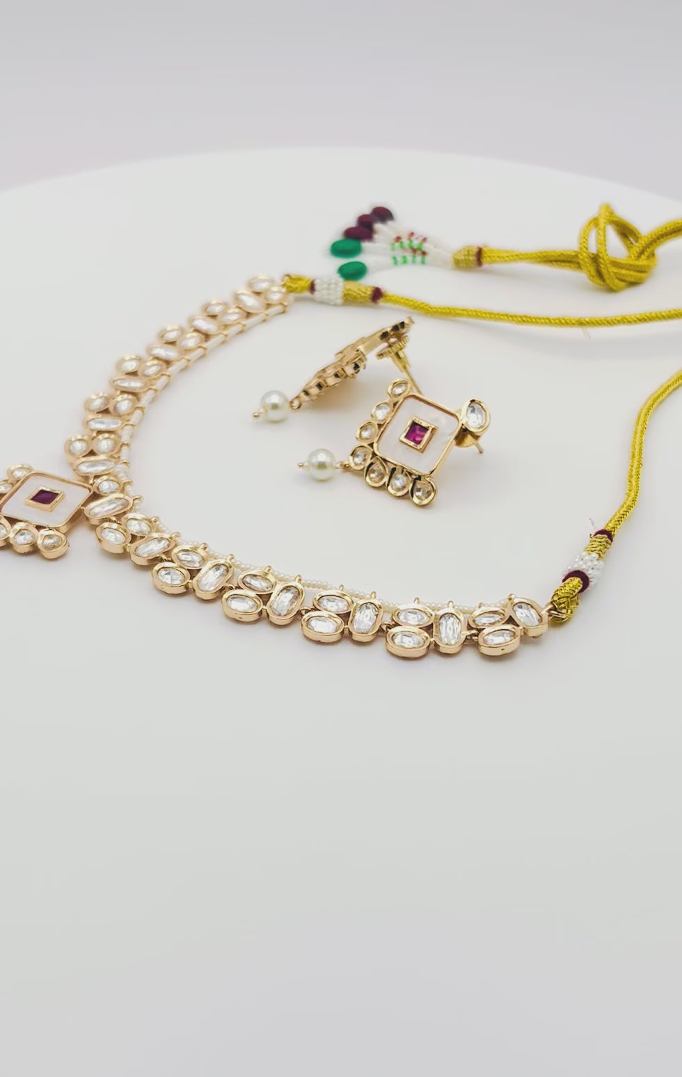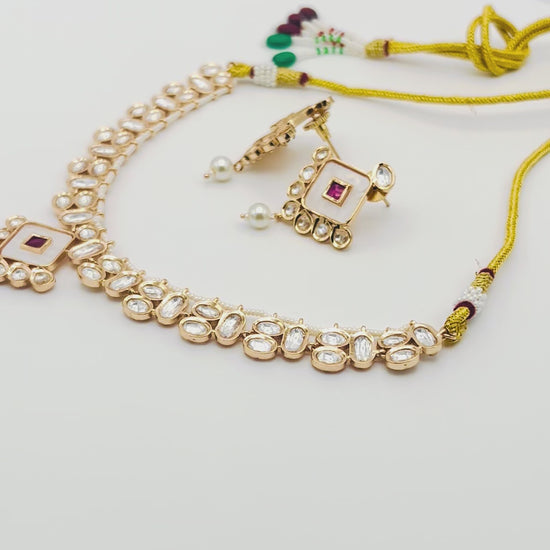 Introducing an exquisite choker necklace and earring set that perfectly blends traditional Indian artistry with contemporary style. This elegant set is designed to sit beautifully around the neck, making it a versatile choice for modern and classic outfits. ✨ Key Features & Design Highlights: • Choker Style: The necklace features a flexible, linked band of uncut Polki stones Kundan, often called 'diamond-look,' set in a beautiful gold-tone framework. • Centerpiece: The main pendant features a striking diamond-shaped motif with smooth white Meenakari work, accented by a small, central ruby-colored stone. A delicate faux pearl drop hangs from the bottom, adding movement and elegance. • Earrings: The matching stud earrings mirror the central diamond/square pendant design, also featuring the white enamel and the central ruby accent, complete with a small, delicate pearl drop. • Adjustable Dori: The necklace is secured with a traditional gold-colored dori cord, which is fully adjustable, ensuring a perfect fit for any neckline. The ends of the dori are finished with decorative green and maroon beads. • Versatility: Its light-weight construction and elegant design make it suitable for a wide range of occasions, from formal events and weddings to festive parties and Indo-Western fusion looks. 📐 Measurements • Necklace Design Length (Stone section): Approximately 5 to 6 inches, with attached adjustable long dori for comfortable wearing. • Center Pendant Drop: Approximately 1.5 inches. • Earring Drop: Approximately 1.5 inches. 🎁 Perfect For: • Wedding Guests, Sangeet, Mehendi, and Cocktail Parties • Pairing with Sarees, Lehengas, Anarkalis, and Gowns • Anniversary or Birthday Gifts • Anyone who loves fine ethnic and traditional jewelry. Care Instructions: Keep away from moisture, perfumes, and sprays. Store in a sealed bag or box.