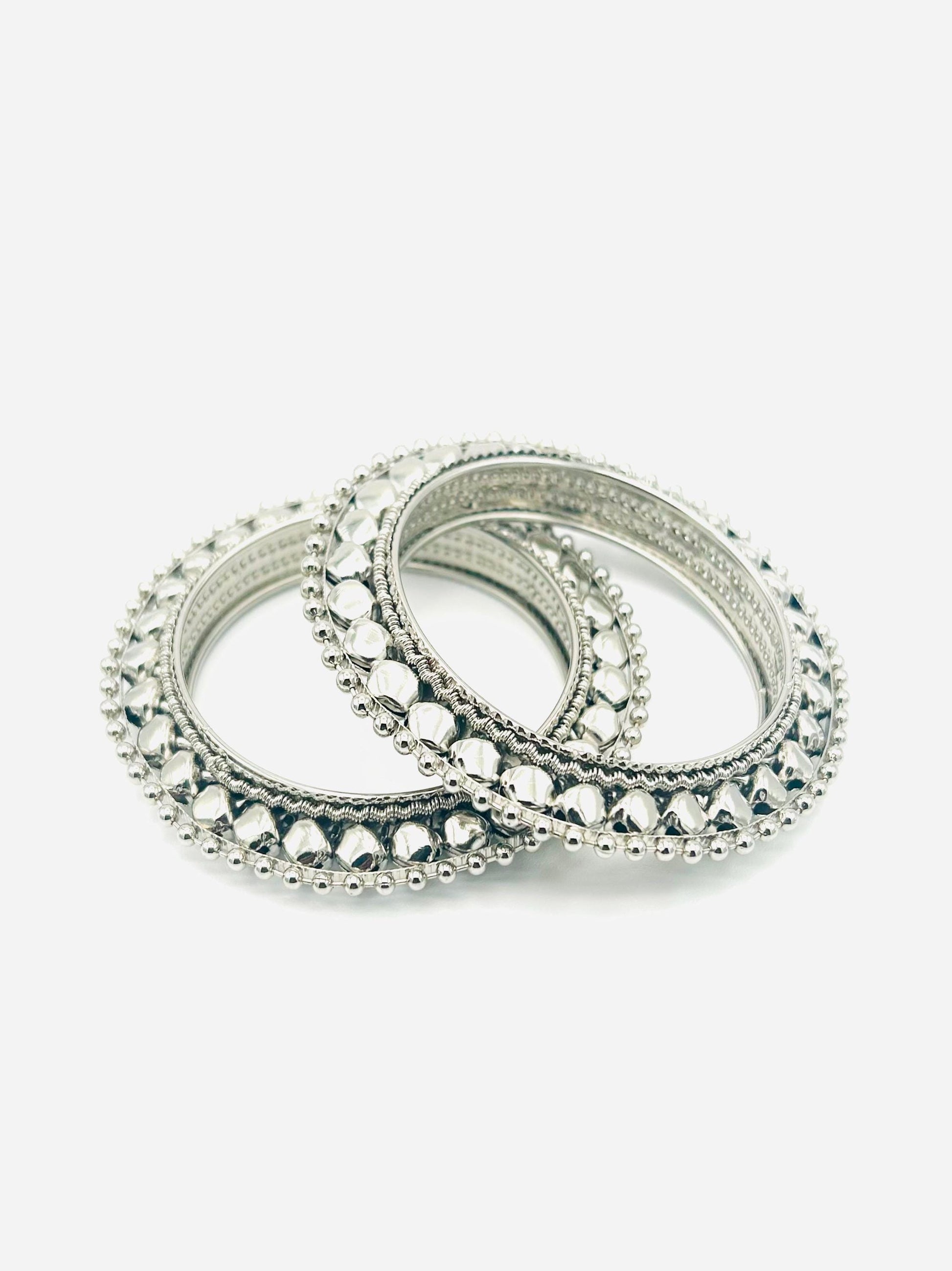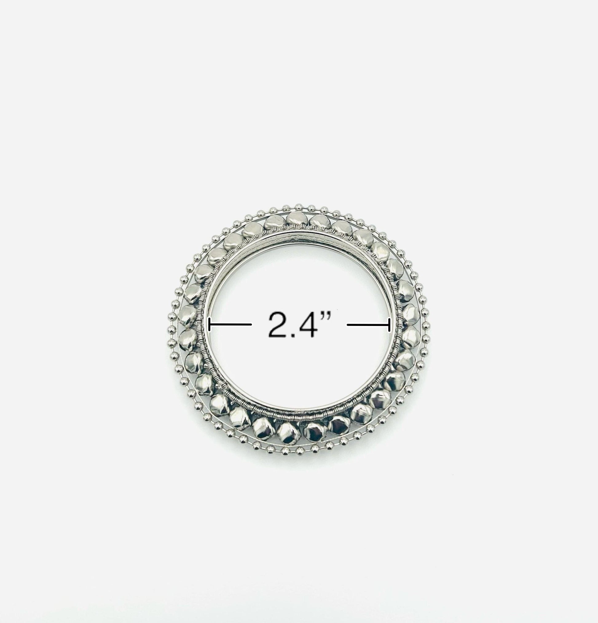 Traditional Ghungroo Style Statement Bangles Set of 2 Elevate your festive attire with this luxurious pair of statement bangles, inspired by the high-end look of traditional Indian jewelry. This design beautifully incorporates the Ghungroo style, featuring delicate metal beadwork that borders the entire bracelet. The main focal point is the continuous row of large, polished dome pieces often referred to as Polki or Kundan style work, creating a brilliant, mirror-like effect that shines from every angle. ✨ Key Features • Style Name: Ghungroo Style—referring to the classic metal bead/bobble detailing that frames the central. • Accents: Large, bezel-set dome pieces that mimic the look of traditional Polki/Kundan stones for a brilliant, reflective finish. • Design: light weight, perfect for making a bold, ethnic statement. • Occasion: Ideal for weddings, Sangeet, Navratri, and other grand festive occasions. available size: 2.4”,2.6”