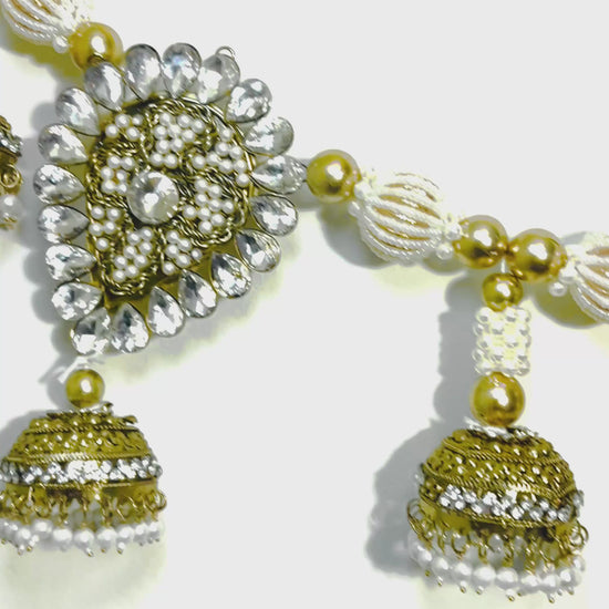 This stunning 42-inch toran features shiny silver-toned beads, white beads, and golden accents with a central circular medallion showcasing detailed floral or geometric patterns. The prominent jhumka-style bell pendants add authentic Indian charm, adorned with white beads and metallic accents.