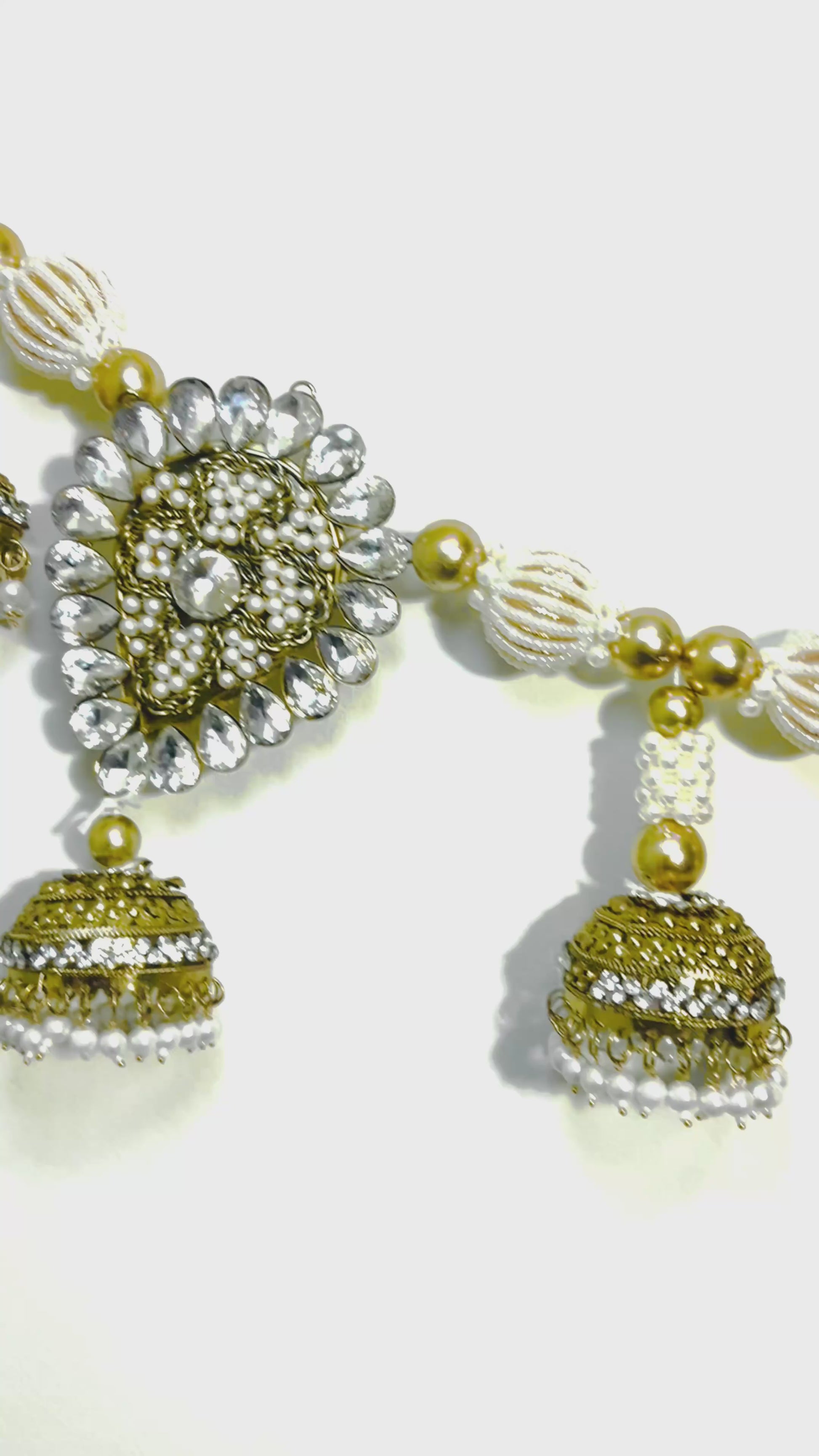 • Beaded Design: Multiple strands of white beads and smaller metallic accents