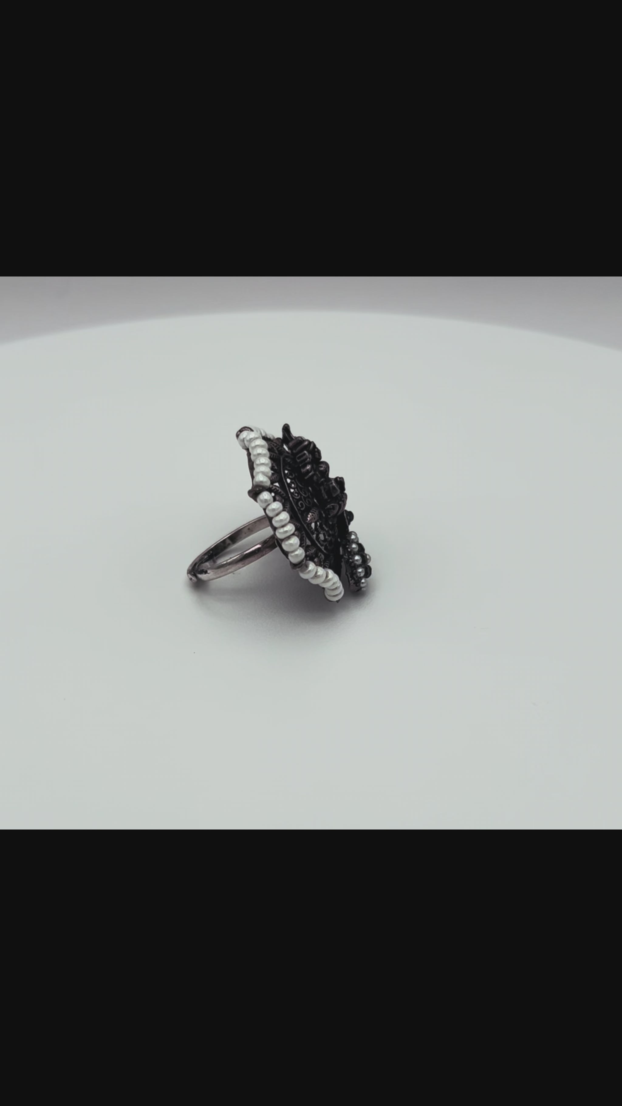 This striking ring features traditional temple-inspired design with an elegant pearl-style border, creating a bold accessory for special occasions.